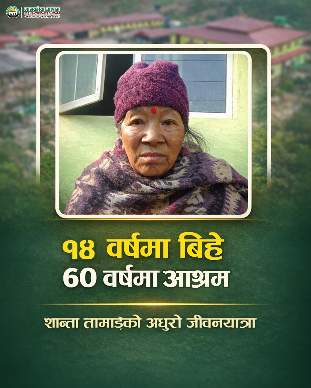 काठमाडौँ । काभ्रे घर बताउने ६० वर्षीय शान्ता तामाङ काठमाडौँमा रहेकाे मानवसेवा आश्रम रानीवन शाखामा बस्दै आएको तीन वर्ष पुगेको छ। सोमबार आश्रमको आँगनमा उनी मलिन अनुहार लिएर बसेकी थिइन्। जीवनप्रति खासै उत्साह देखिँदैनथ्यो, आँखामा निरासा थियो, मन गाँठो परेकाे थियाे ।